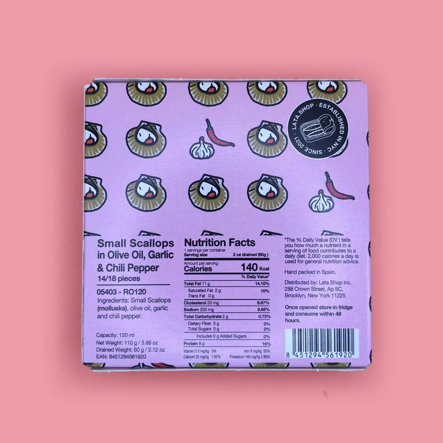 (120gr) Delicately tender and bursting with flavor, these small scallops are a gourmet delight preserved in rich Spanish olive oil infused with garlic and just the right touch of chili pepper.